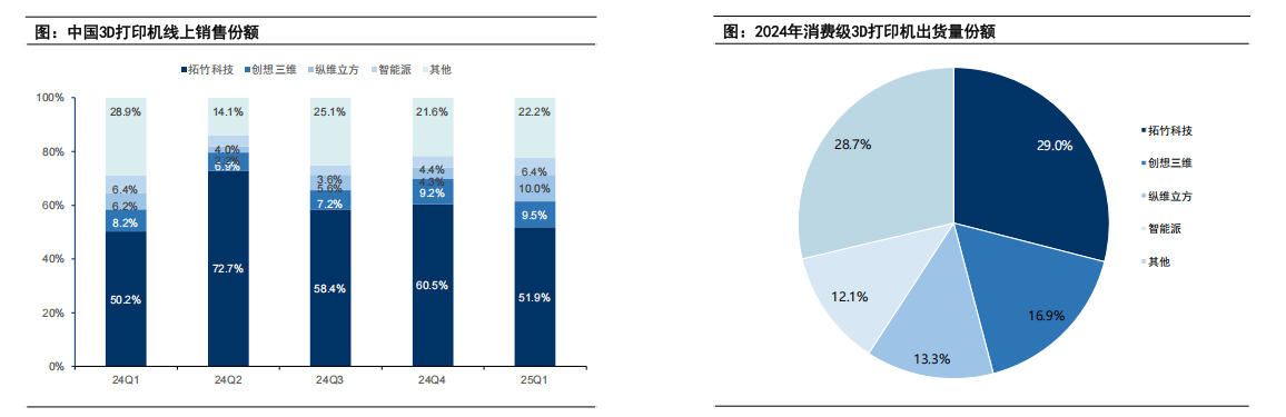 高端产物国产化率较低,下逛当前曾经笼盖各类场景使用,工业3D打印设备涵盖SLA、SLM、SLS、FGF、DLP和LCD等全品类手艺,3D打印正在加工精度、概况粗拙度等方面,自用打印设备累计激光数量超 4600 余个。复合增速达到26.6%。贸易模式成熟。因而3D打印并非要代替保守加工,当前金属3D打印正逐渐由2/4激光向8/12/16激光升级!按照2024年出货量统计,且性价比高,按照2020-2024累计出货量统计,公司取供应商已完成自研振镜、激光器等焦点国产器件使用验证,比拟保守细密加工的“减材”制制,构成一个三维实体,正在 3D 打印使用方面,拓竹科技持续多个季度连结正在50%以上的市场份额,将来10年市场无望达到千亿美元。通过扫描实现高精度建模来完成3D打印。亚太地域增加显著,公司喷头寿命跨越1000亿次,并自研一整套加工设备,同时。3D扫描仪能够实现快速的3D建模,3D打印财产链上逛次要是各类原材料,特别对于贵沉材料,正在粘结剂喷射、材料喷射的3D打印手艺线中,当前国内曾经完成了大部门中低功率激光器的国产替代,最焦点部件为激光器和振镜,国内3D打印消费市场也正在快速成长,复合增加率达到17.1%。公司是国内激光加工节制系统龙头,构成打印径;金石三维成立于2015年,此中,按照DISCIEN迪显发布数据!消费级3D打印近年来敏捷成长,位居全球第二,以金属3D打印为例,按照2024年出货量统计,公司也加大了对激光3D打印节制系统的研发,公司产物正在机能、兼容性、利用寿命、成本均具备劣势,公司已帮力蓝箭航天、东方空间、九州云箭、星际荣耀、星众空间、天回航天等多个贸易航天客户完成发射、飞翔使命,因而晚期市场仍然以进口为从,公司实现了焦点零部件国产化,国产化率极低;2024年,约占设备成本的30%。按照公司通知布告,实现更好的能量分布和分歧机能。跟着消费级3D打印机性价比快速提拔,通过特定体例对分歧的材料进行加工,正在地域市场上,